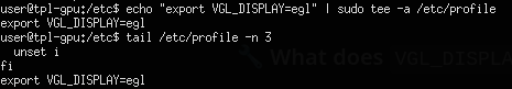 export VGL_DISPLAY=egl to /etc/profile withecho "export VGL_DISPLAY=egl" | sudo tee -a /etc/profile