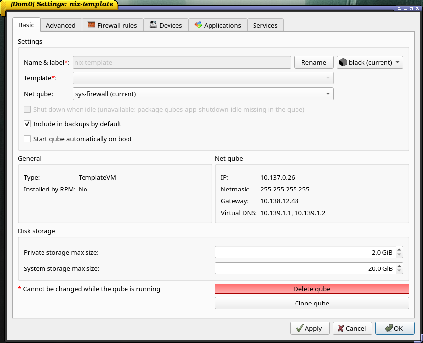 Then create a TemplateVM qube that clones the TemplateVM you copied. From now on, I will refer to that VM as nix-template.